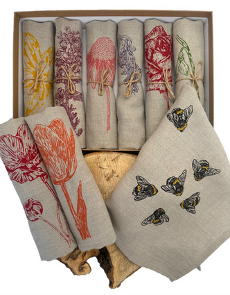 Our handmade linen napkins are designed to be used, washed, and enjoyed for many years. Created as a sustainable alternative to disposable tableware, each napkin combines traditional screen printing with natural materials, creating napkins that are both practical and timeless.